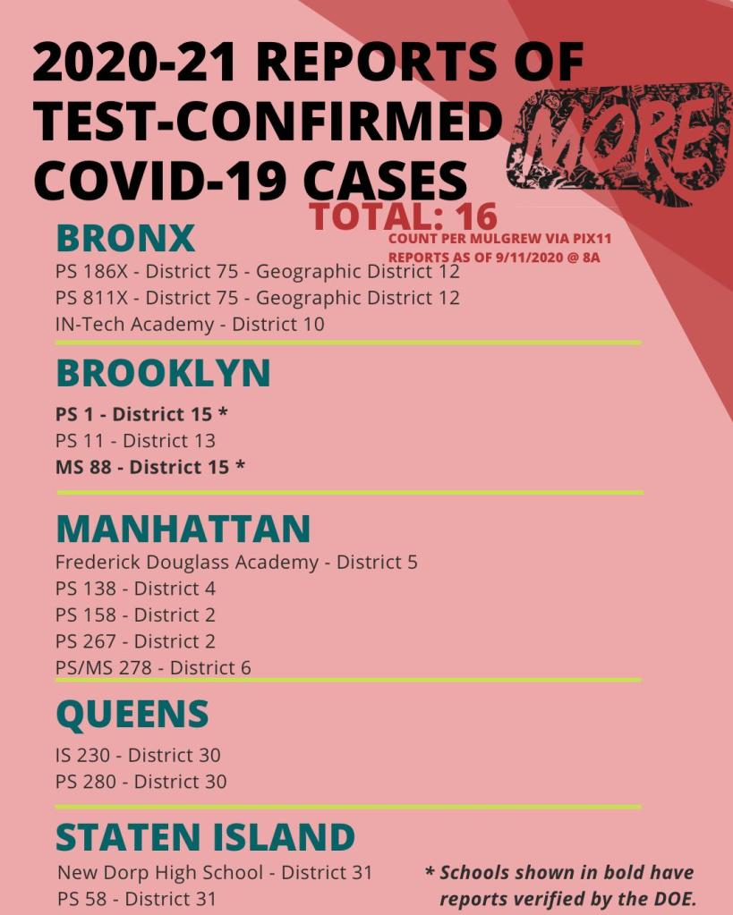 Already with the cases announced yesterday, we’ve witnessed the same lack of transparency from the NYC Department of Education that we saw in the spring and summer regarding supplies, funding, safety, and logistics to make reopening schools in-person safe. We demand rapid transparent communication about cases within school buildings to keep us safe.